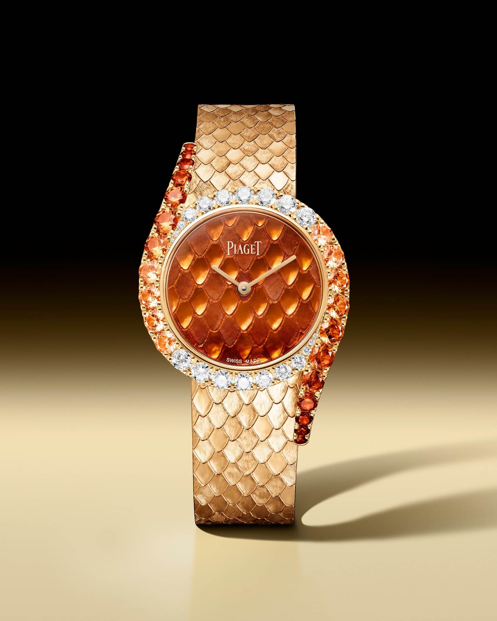 Cho mùa xuân 2026, Piaget giới thiệu hai mẫu Limelight Gala mới. Xứng đáng là tâm điểm, chiếc đồng hồ đầu tiên rực lửa với mặt số tráng men Grand Feu màu cam cháy trên vàng chạm khắc mô phỏng da rắn. Bộ vỏ tròn được viền quanh bởi hàng kim cương uốn lượn đính đá spessartite garnet màu hoàng hôn, tựa lên dây đeo vàng chạm hoa văn vảy rắn.